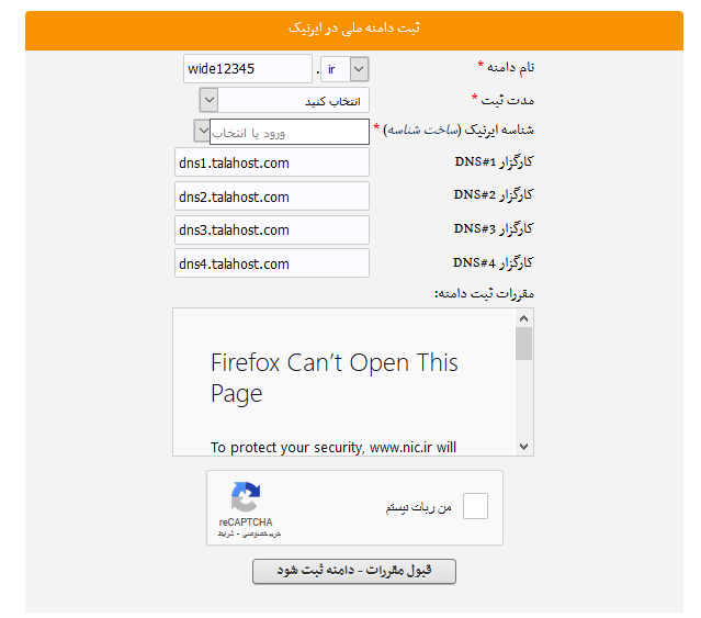 مدت زمان ثبت رو انتخاب کنید و شناسه نیک که یادداشت کرده بودید را وارد کنید ،کادر کارگزار هارا لطفا تغییر ندهید